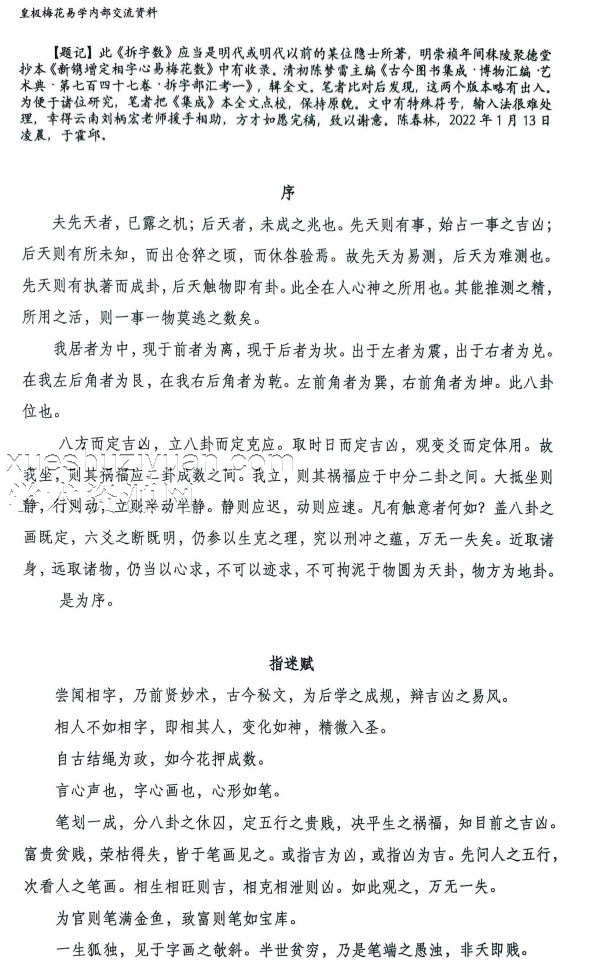 ## 陈春林秘本拆字术学习笔记本文介绍了陈春林秘本拆字术的基本原理和应用方法,通过拆字分析,揭示汉字背后的深层含义和人生智慧。### 知识点1:拆字术的基本原理- 拆字术是一种通过分析汉字结构来揭示其深层含义的方法。- 汉字由笔画组成,每个笔画都有其特定的象征意义,通过拆分汉字,可以深入了解其背后的文化内涵和人生智慧。> 原文引用:拆字术,顾名思义,就是将一个汉字拆分成多个部分,通过分析每个部分的意义,来揭示整个汉字所蕴含的智慧和哲理。汉字作为中华文化的载体,其背后蕴含着丰富的文化内涵和人生智慧,通过拆字术,我们可以更深入地了解这些内涵和智慧。### 知识点2:拆字术的应用方法- 拆字术可以应用于姓名分析、命理预测、风水布局等方面。- 通过分析个人的姓名,可以了解其性格特点和命运走向;通过分析风水布局,可以调整环境气场,提升生活品质。> 原文引用:拆字术的应用范围非常广泛,可以用于姓名分析、命理预测、风水布局等方面。例如,在姓名分析中,我们可以通过拆分个人的姓名,来揭示其性格特点和命运走向;在风水布局中,我们可以根据拆字术的原理,调整环境气场,提升生活品质。### 知识点3:拆字术的实践案例- 拆字术在实践中有着广泛的应用,可以通过具体案例来展示其实际效果。- 通过分析具体案例,可以深入了解拆字术在实际应用中的操作方法和注意事项。> 原文引用:拆字术不仅是一种理论,更是一种实践。在实际应用中,我们可以通过分析具体案例,来深入了解拆字术的操作方法和注意事项。例如,在姓名分析中,我们可以通过拆分某个人的姓名,来揭示其性格特点和命运走向,并给出相应的建议和指导。这些实践案例不仅可以展示拆字术的实际效果,也可以帮助我们更好地掌握其应用方法。